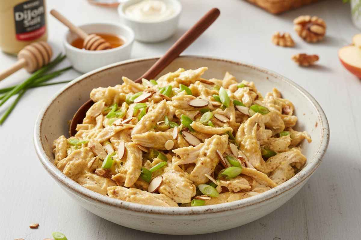 How to make it (briefly): Whisk mayo with Dijon, honey, and a small splash of vinegar until smooth and glossy. Season with salt, a pinch of garlic and white pepper. Fold in chicken, green onions, and almonds until just coated. Chill for a short rest so the dressing sets. Serve on toasted sourdough, in croissants, or spooned into lettuce cups for a lighter plate.