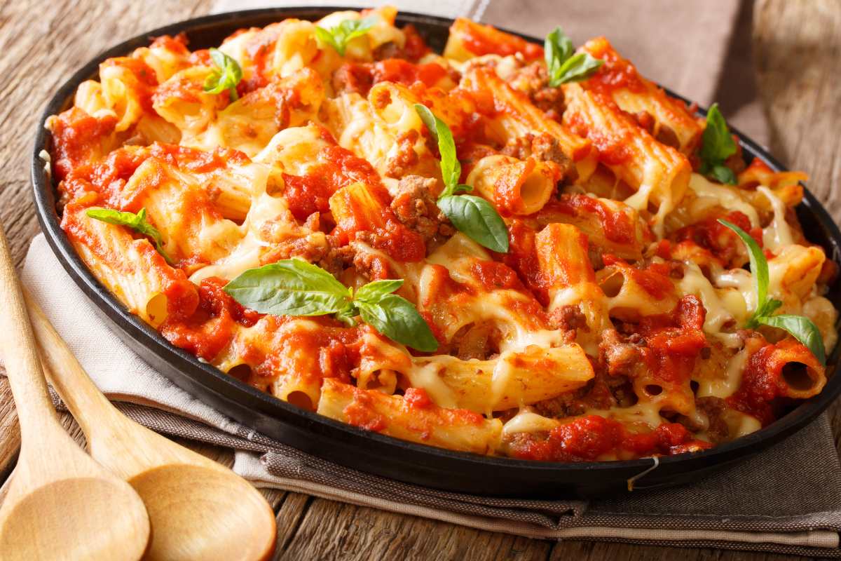 How to make: Brown turkey with onion and Italian herbs. Add tomato sauce and a spoon of tomato paste. Toss with cooked ziti and ricotta; top with mozzarella and bake until bubbly. Finish with basil and black pepper.