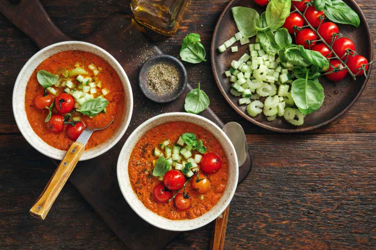 The foundation includes ripe tomatoes, cucumber, green bell pepper, onion, garlic, sherry vinegar, and extra virgin olive oil. Unlike many modern versions, a touch of day-old bread is traditionally added to give body and creaminess.
