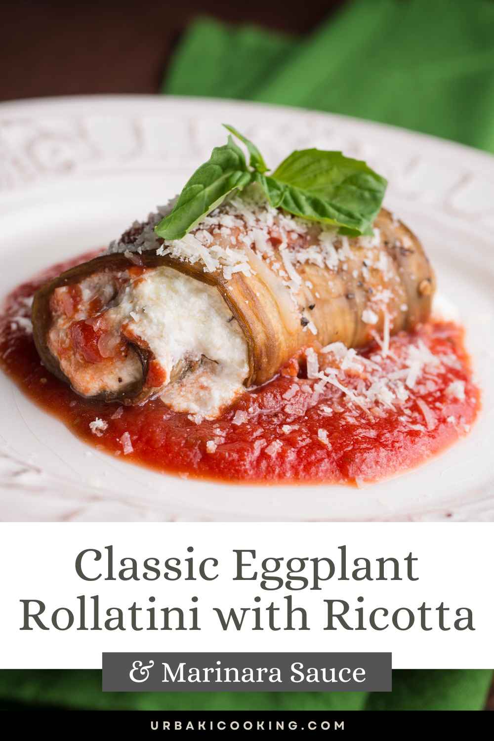 Eggplant Rollatini is a baked dish where thin slices of eggplant are filled with a ricotta cheese mixture, rolled up, and smothered in marinara sauce.