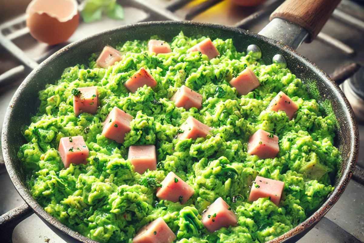 Crack the eggs into a bowl, add a pinch of salt and pepper, and whisk until fully combined. Stir in the green puree until the color is evenly distributed. If you want lighter, fluffier eggs, add a tablespoon of milk or water while whisking.