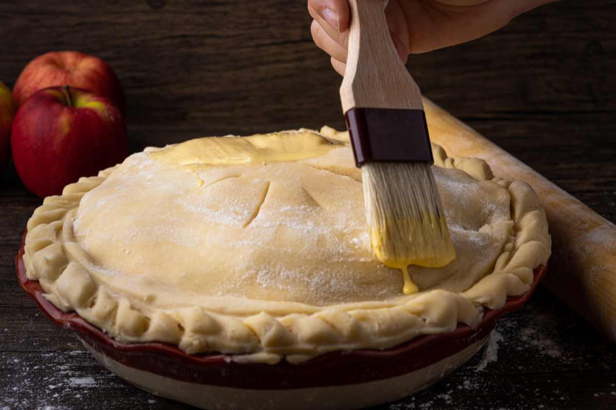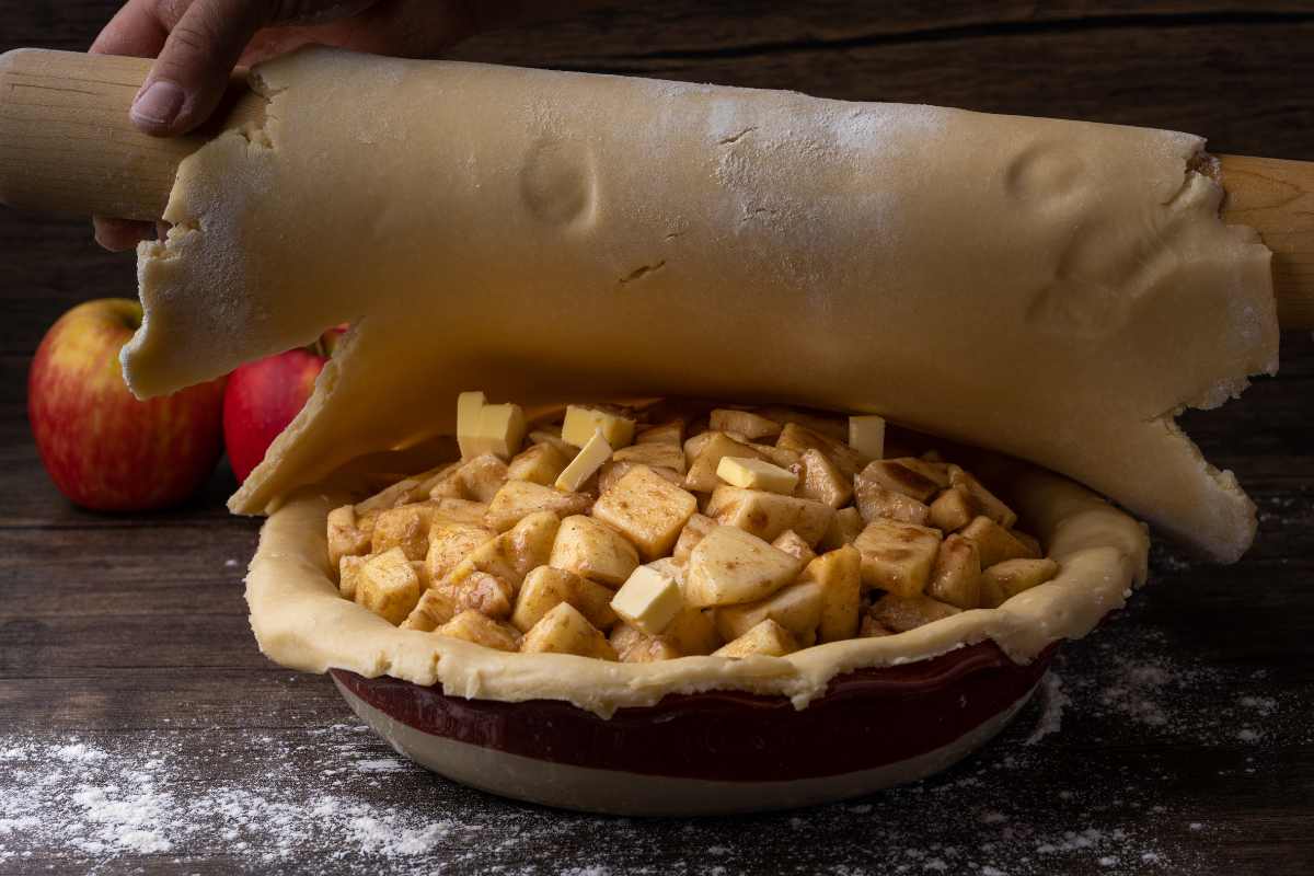 Assemble: Roll one disk, line a 9-inch pie plate, and mound in the apples. Dot with butter. Top with the second crust (or lattice), trim, crimp, brush with egg wash, and sprinkle sugar.
